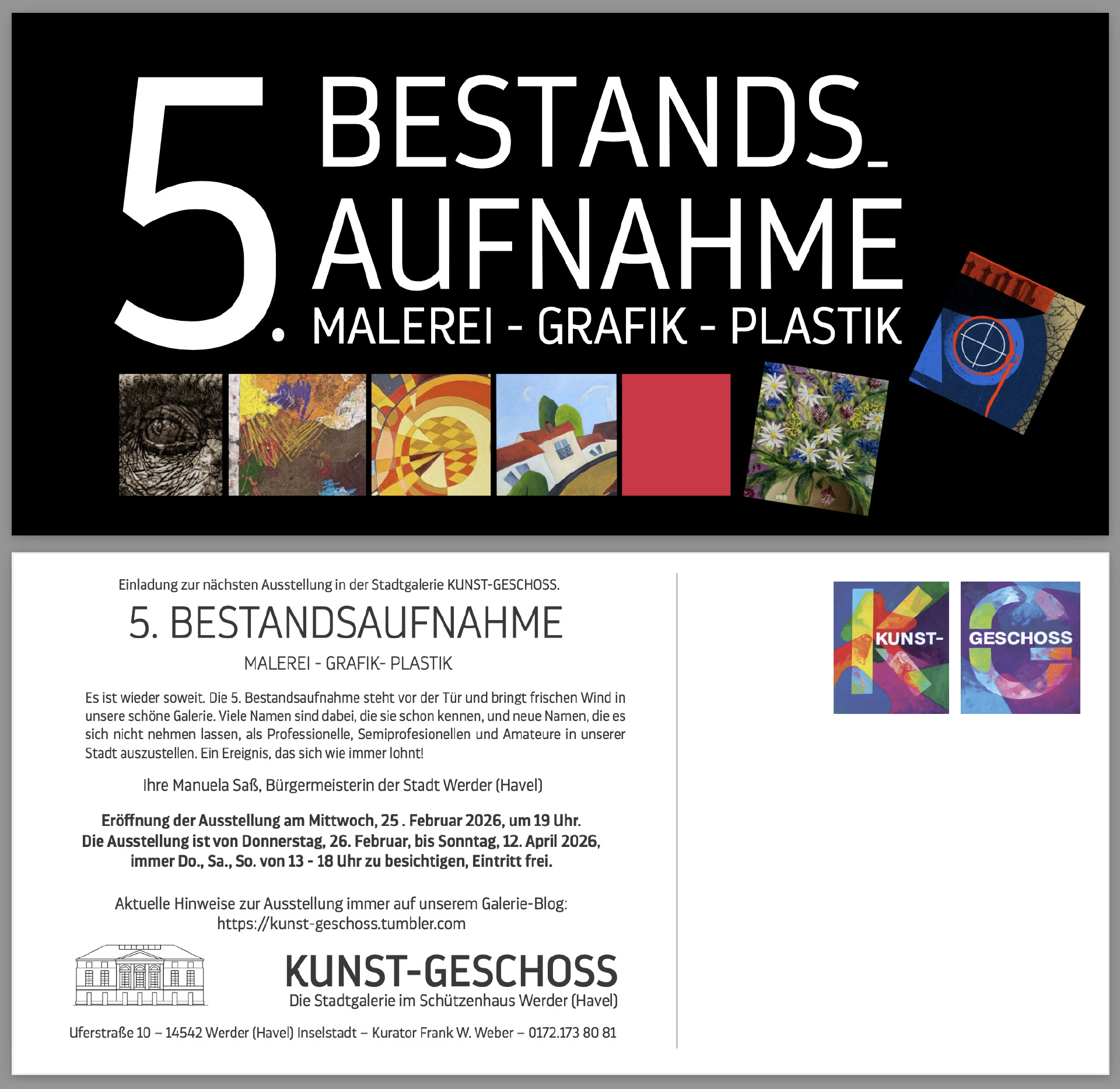 25 Künstlerinnen und Künstler aus der Stadt Werder (Havel) stellen aus und zeigen jeweils 2 Werke aus ihrem Schaffen.