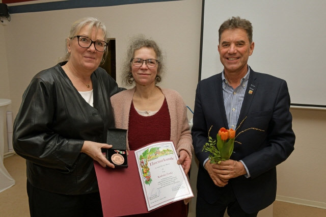 Besondere Ehrung für Kathrin Zosky: Zum Neujahrsempfang in Töplitz wurde der verdienten Töplitzerin von Bürgermeisterin Manuela Saß und Ortsvorsteher Frank Ringel die Ehrenurkunde der Stadt Werder (Havel) überreicht.